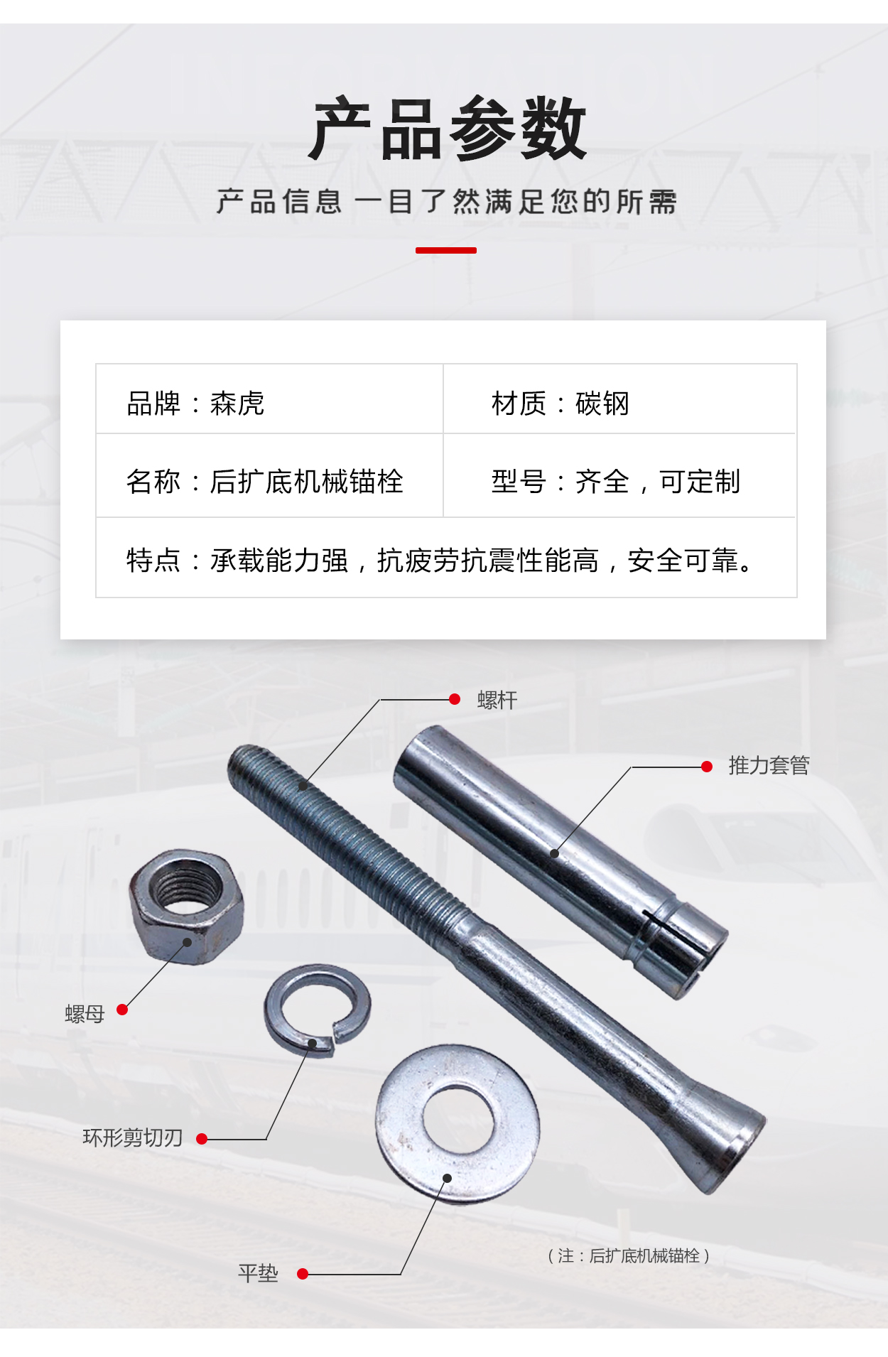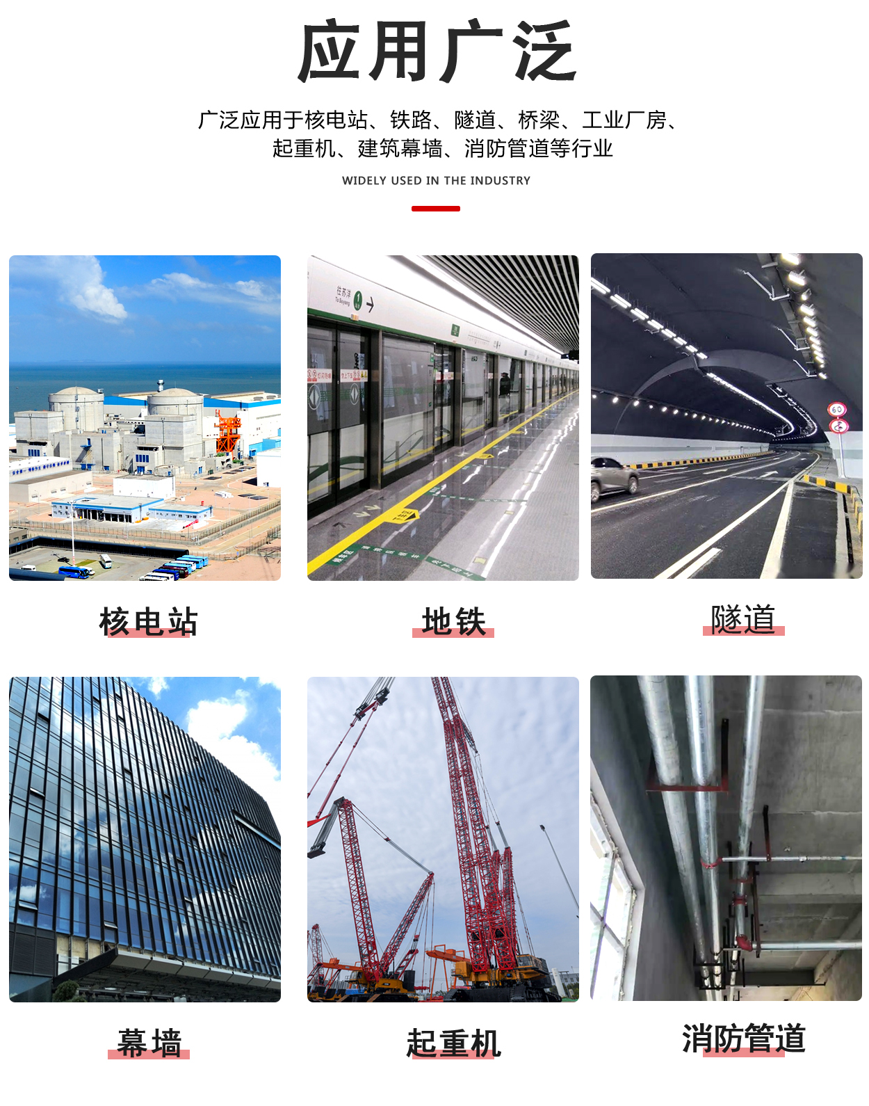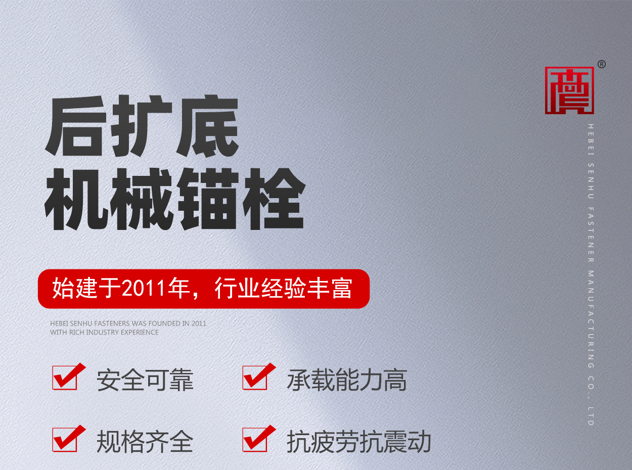 適用范圍: 1.橋梁,鐵路,隧道,地鐵中各類管道,線纜支架的安裝固定。2.工業(yè)廠房,起重機(jī),核電站等大型設(shè)備的安裝和固定。3.民用建筑各種管道如水電管道,消防管道的安裝和固定。4.各種幕墻結(jié)構(gòu)和鋼結(jié)構(gòu)等不同支撐的連接和固定。5.隔音板和其他擋護(hù)板的安裝與固定。6.防盜門,防火門,防盜窗的安裝。
