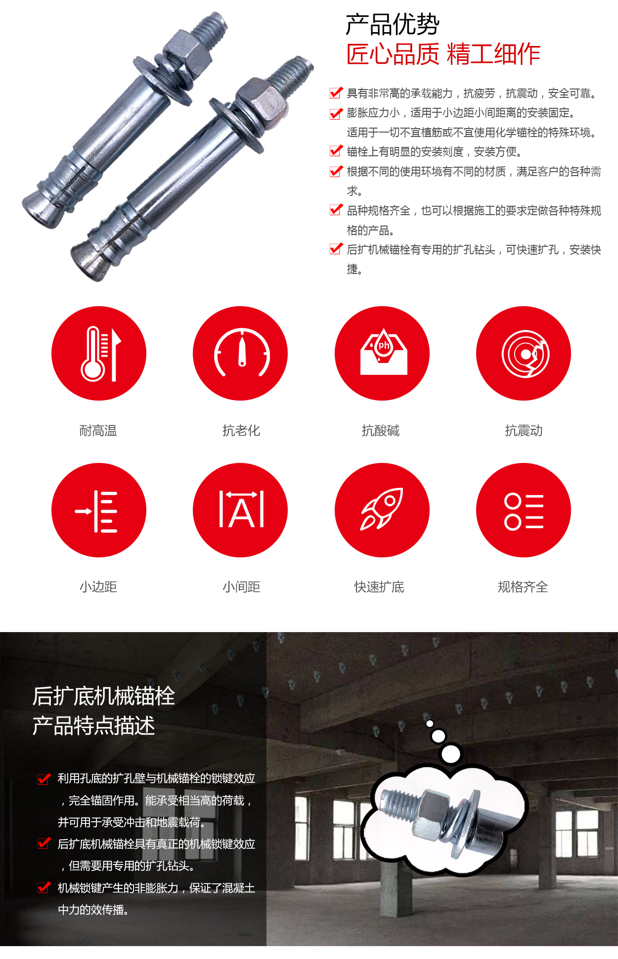 主要生產(chǎn):化學(xué)錨栓、機(jī)械錨栓、定型化學(xué)錨栓、高強(qiáng)度8.8級化學(xué)錨栓、自切底錨栓、車修壁虎,膨脹螺栓,植筋膠等,產(chǎn)品暢銷全國