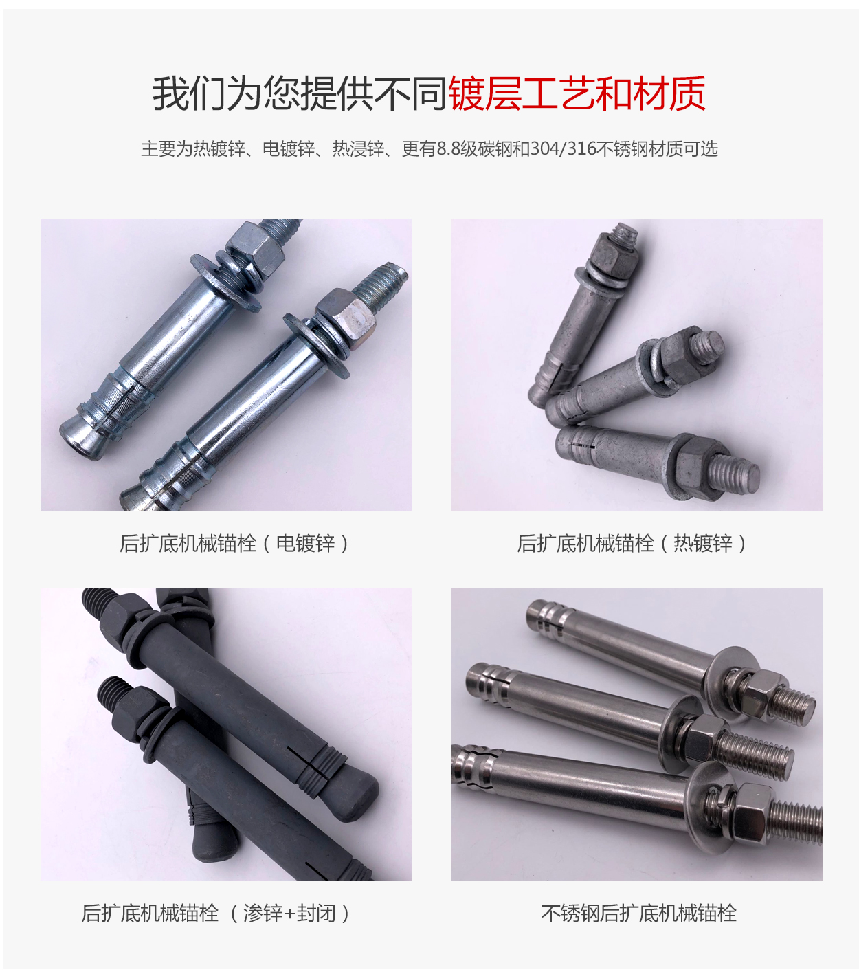 YG型系列脹錨螺栓(膨脹螺栓)可以定制電鍍鋅,熱鍍鋅,達(dá)克羅,滲鋅,級別有4.8級 5.8級 6.8級8.8級10.9級12.9級,全方位的為客戶 提供各種需要保障